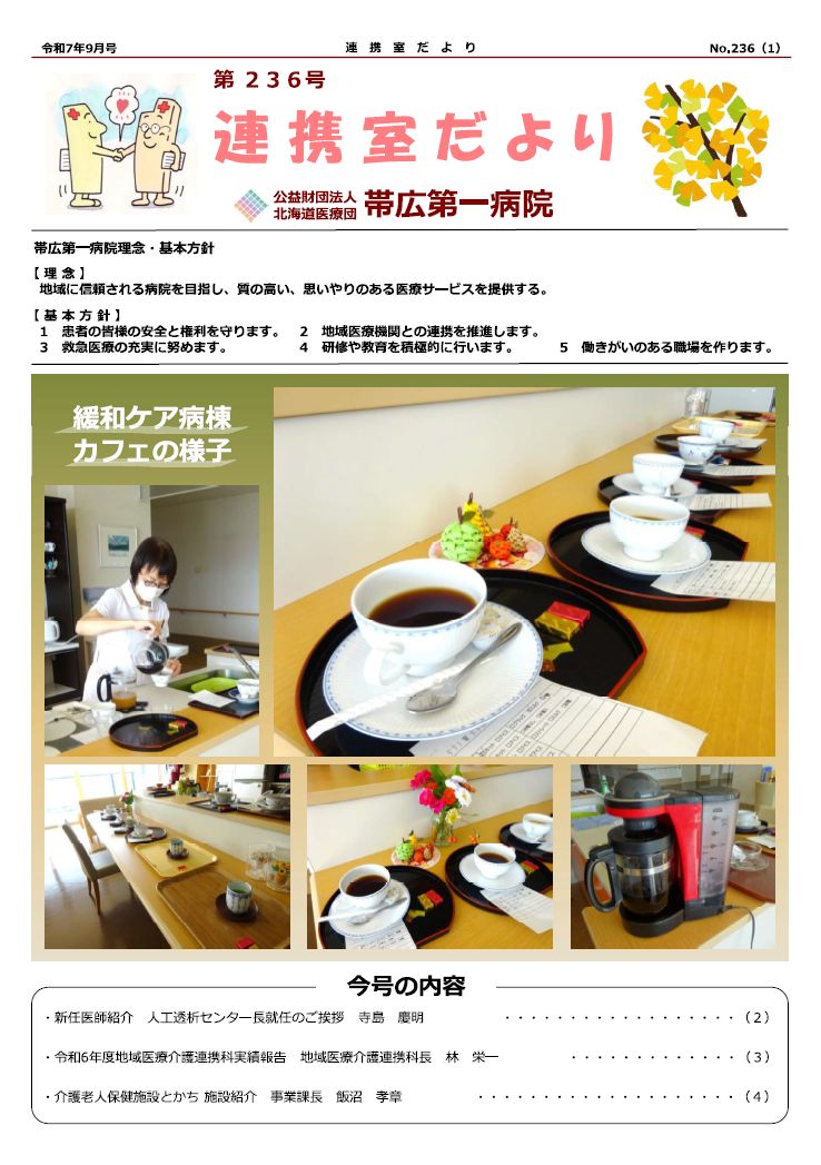 医療機関向け広報誌「連携室だより」第236号 投稿日 2025年10月10日 著者 管理者 カテゴリー 医療機関向け広報誌「連携室だより」 「連携室だより」は地域医療連携室が発行する、医療機関向け広報誌です。当院の情報や活動を毎月お伝えしておりますので、ぜひご覧ください。 連携室だより 第236号2025年9月号 今号の内容 新任医師紹介 人工透析センター長就任のご挨拶 令和6年度地域医療介護連携科実績報告 介護老人保健施設とかち 施設紹介 連携室だより第236号を読む(PDF)