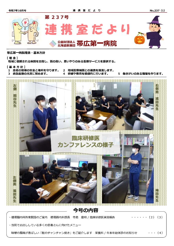医療機関向け広報誌「連携室だより」第237号 投稿日 2025年11月25日 著者 管理者 カテゴリー 医療機関向け広報誌「連携室だより」 「連携室だより」は地域医療連携室が発行する、医療機関向け広報誌です。当院の情報や活動を毎月お伝えしておりますので、ぜひご覧ください。 連携室だより 第237号2025年10月号 今号の内容 循環器内科外来開設のご案内 臨床研修医実績報告 当院でお出ししている多くの患者さんに向けたメニュー 味噌の風味が香ばしい「鮭のチャンチャン焼き」をご紹介します 年末年始休診のお知らせ 連携室だより第237号を読む(PDF)