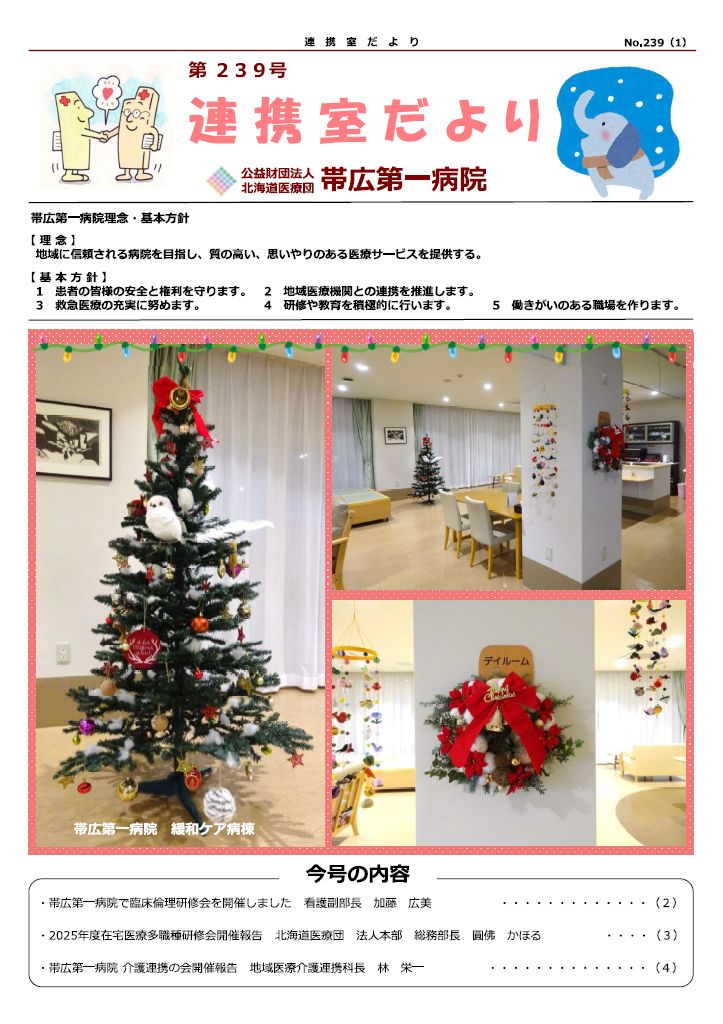 医療機関向け広報誌「連携室だより」第239号 投稿日 2026年1月27日 著者 管理者 カテゴリー 医療機関向け広報誌「連携室だより」 「連携室だより」は地域医療連携室が発行する、医療機関向け広報誌です。当院の情報や活動を毎月お伝えしておりますので、ぜひご覧ください。 連携室だより 第239号 今号の内容 帯広第一病院で臨床倫理研修会を開催しました 2025年度在宅医療多職種研修会開催報告 帯広第一病院 介護連携の会開催報告 連携室だより第239号を読む(PDF)