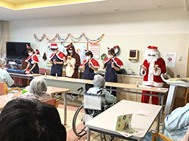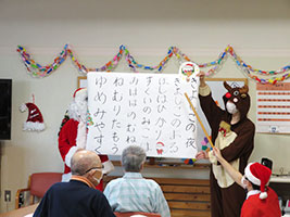 クリスマスレクリエーション場面では、演目を通して普段見ることができない患者様の素敵な笑顔をたくさん見ることができました。普段の病院生活ではなかなか出てこないお菓子や飲み物に大変ご満足いただけました。レクリエーションにより入院生活での刺激を与え患者様の心身向上に関わりたいと思います。