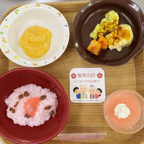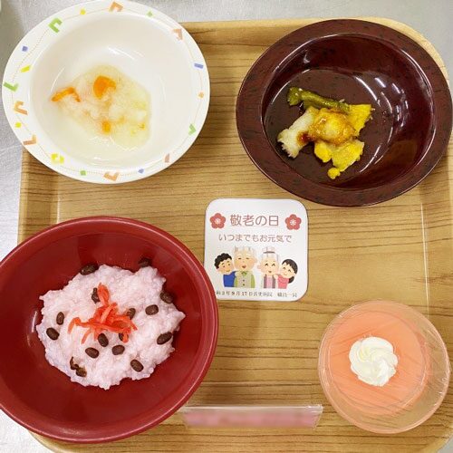 敬老会の献立 … 赤飯、天ぷら、大根おろし酢和え、紅白プリン