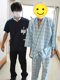 ご本人の意欲も出てきて、寝たきりでしたが、リハビリ訓練にて杖を使用せず、病棟内歩行が出来るまでに回復しました。常にコツコツと…大切です。