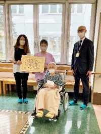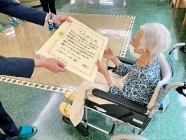今年8月に御歳100歳を迎えられた利用者さんへ、表彰状と記念品が送られました。